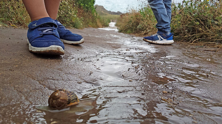 En este caso la imagen empatiza con el sufrido caracol, se pone a su altura. Casi puedes sentir el acoso de ese par de niños gigantes que te observan mientras tratas de cruzar el camino y huir de un final inevitablemente dramático.